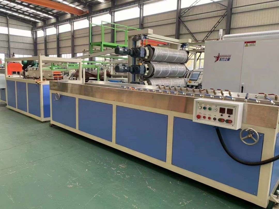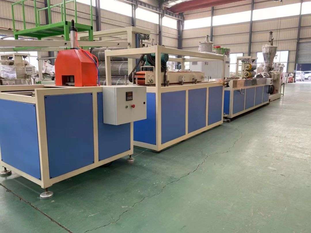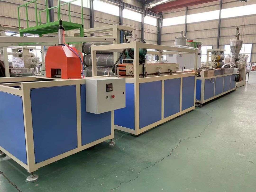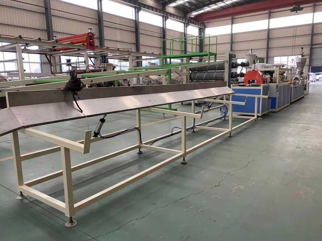 Barisan pengeluaran profil menggunakan SJSZ-65/132 siri extruders twin-screw conical, platform pembentukan vakum keluli tahan karat, traktor crawler, mesin pemotongan automatik, dan membalikkan rak pemunggahan. Platform pembentukan dilengkapi dengan pam vakum tekanan tinggi dan pam air, yang boleh dilaraskan empat dimensi. Traktor itu diapit secara pneumatik. Mesin pemotongan panjang tetap automatik menggunakan suis perjalanan untuk dipotong ke panjang tetap. Rak penyusunan adalah 6 meter panjang, diperbuat daripada keluli tahan karat, dan pneumatically terbalik.