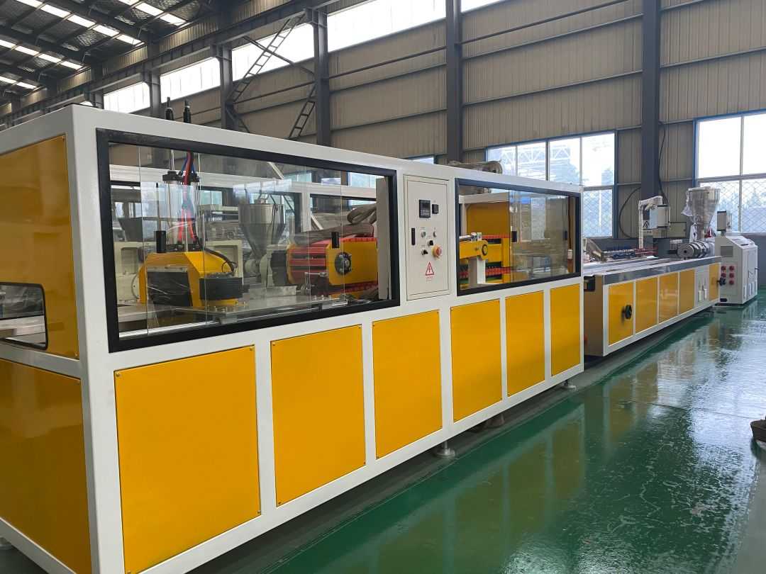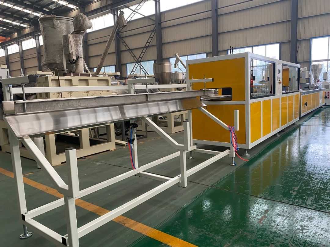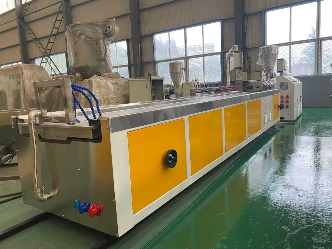 Mesin barisan pengeluaran plastik PVC terdiri daripada unit pencampuran, extruder berkembar, meja pembentukan vakum, traktor, mesin pemotong, dan rak pelepasan, yang membentuk bahagian utama keseluruhan garisan pengeluaran.
